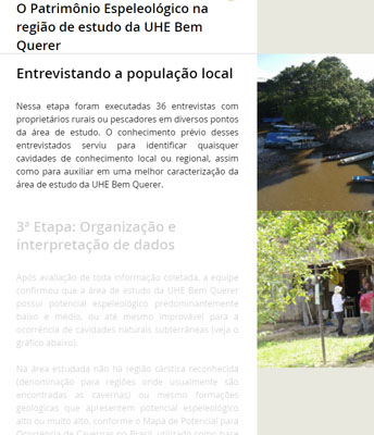 A realização de levantamentos de campo para identificação de cavernas na região onde se pretende construir a UHE Bem Querer é uma das etapas do “Estudo para Avaliação do Potencial Espeleológico”. Por meio desse estudo é possível identificar a existência de cavernas e avaliar a possibilidade da usina causar impacto nesses ambientes. Quer saber mais…